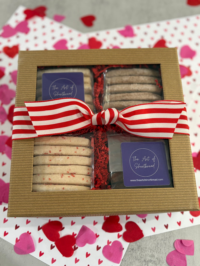 Celebrate a Gluten free lover with our beautifully crafted Two Dozen Gift Box of Shortbread Cookies. Your choice of 4 Gluten Free flavors - 6 cookies per flavor pack. Packaged with crinkle paper and wrapped with a red/white or pink/white ribbon.